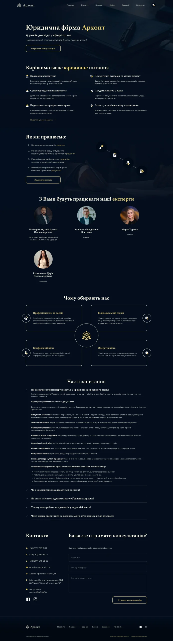 Сайт забезпечує зручну навігацію по послугах, онлайн-запис на консультацію та детальну інформацію про команду юристів.
